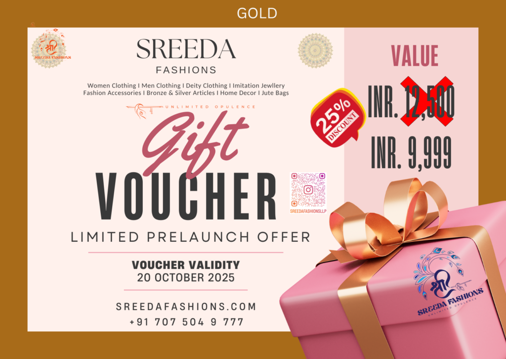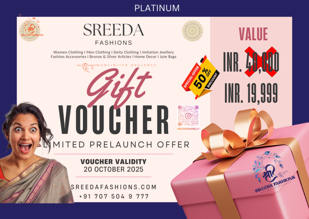 Sreeda Fashions Platinum Gift Voucher for you Or your loved ones. From timeless classics to trendy finds, make the buying unforgettable.  Pleasure with Platinum!